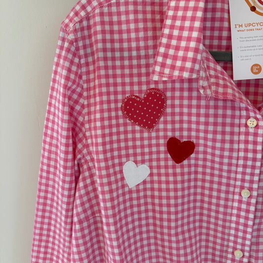 Hearts Appliqué Upcycled Pink Checkered Button-Up Shirt